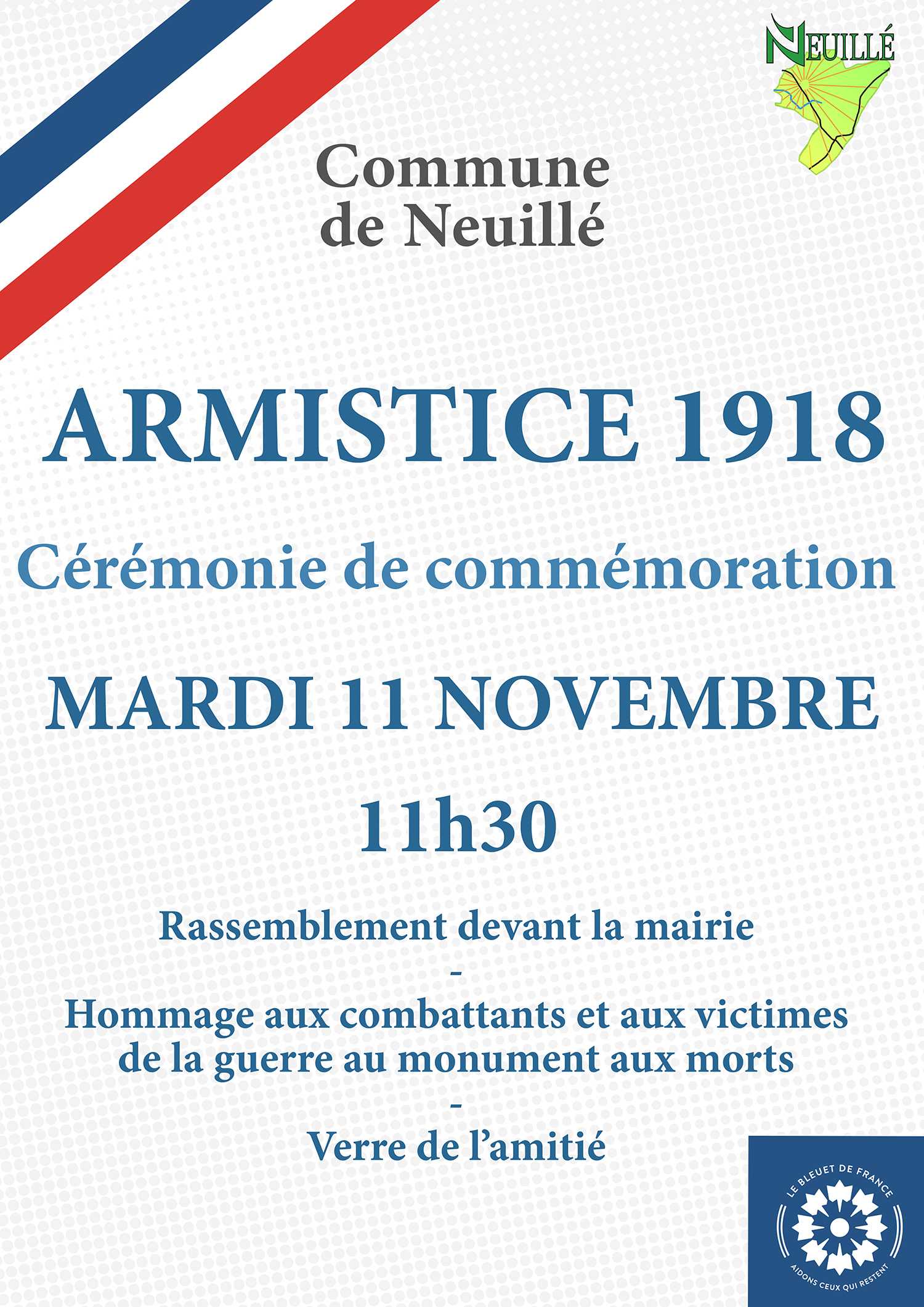 La population est invitée à la cérémonie de commémoration de l'armistice du 11 novembre 1918. Le rendez-vous est fixé le mardi 11 novembre à 11h30 devant la mairie de Neuillé. Un hommage sera rendu au monument aux morts à tous les "morts pour la France" des conflits anciens ou actuels, qu'ils soient civils ou militaires. La cérémonie sera suivie d'un vin d'honneur.